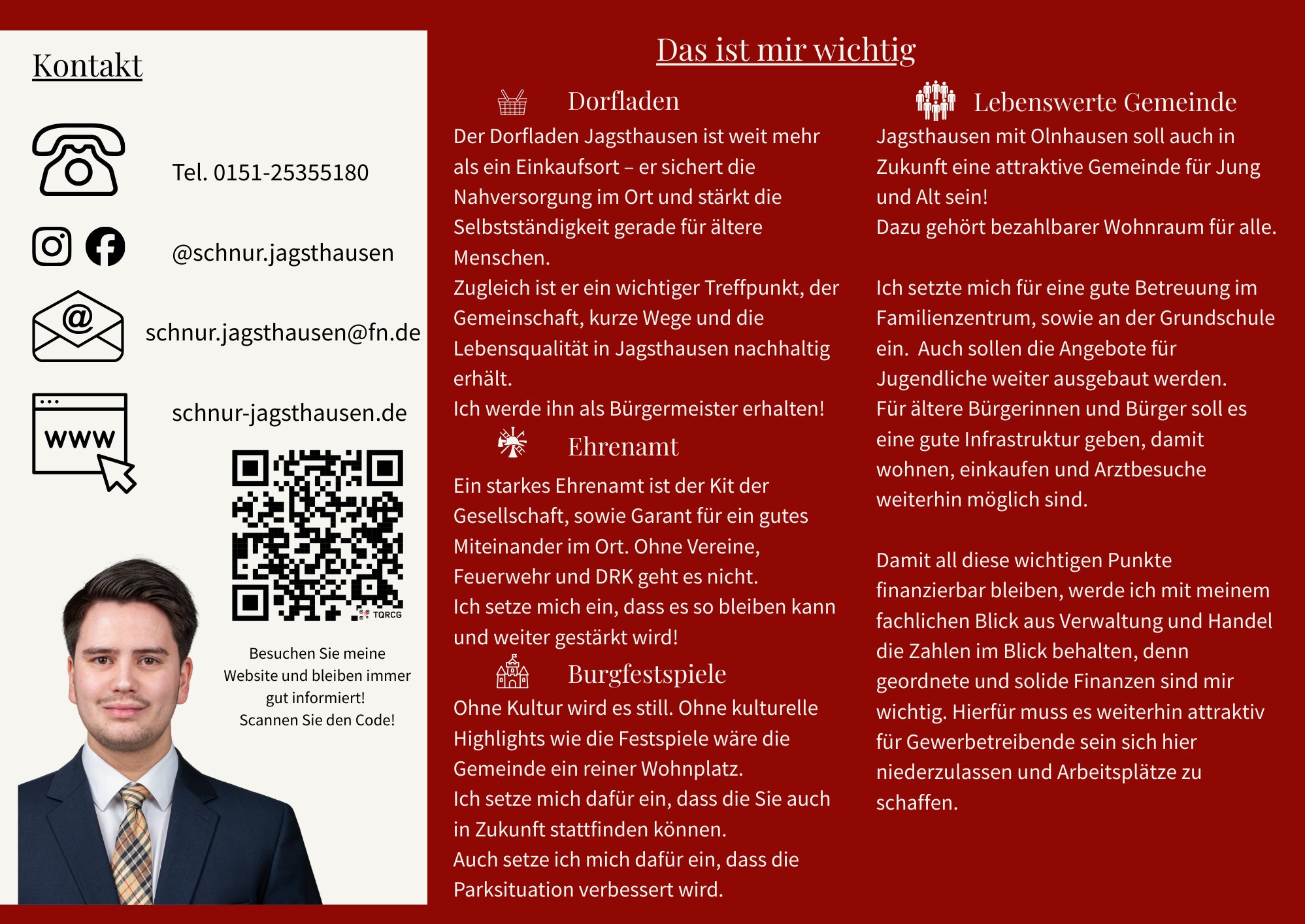 Für den weiteren Verlauf des Wahlkampfes hat Marlon Schnur bereits Veranstaltungen geplant. Diese werden auf der Website www.schnur-jagsthausen.de sowie bei Instagram und Facebook (@schnur.jagsthausen) veröffentlicht.