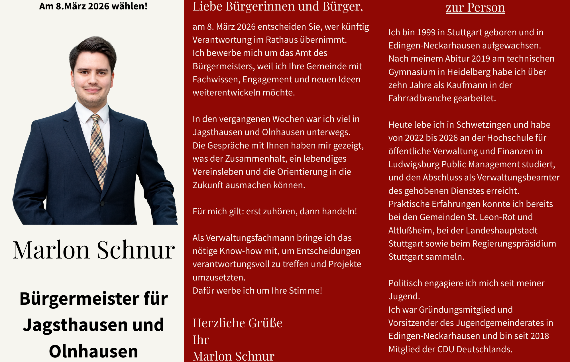 Am 8.März 2026 wird in Jagsthausen mit dem Ortsteil Olnhausen ein neuer Bürgermeister gewählt. Nach vierzig Jahren tritt der Amtsinhaber nicht zur Wiederwahl in der Götz-Gemeinde an. Diese Chance möchte Marlon Schnur ergreifen. Der 26-Jährige hat Public Management in Ludwigsburg studiert und Verwaltung von Grund auf gelernt.